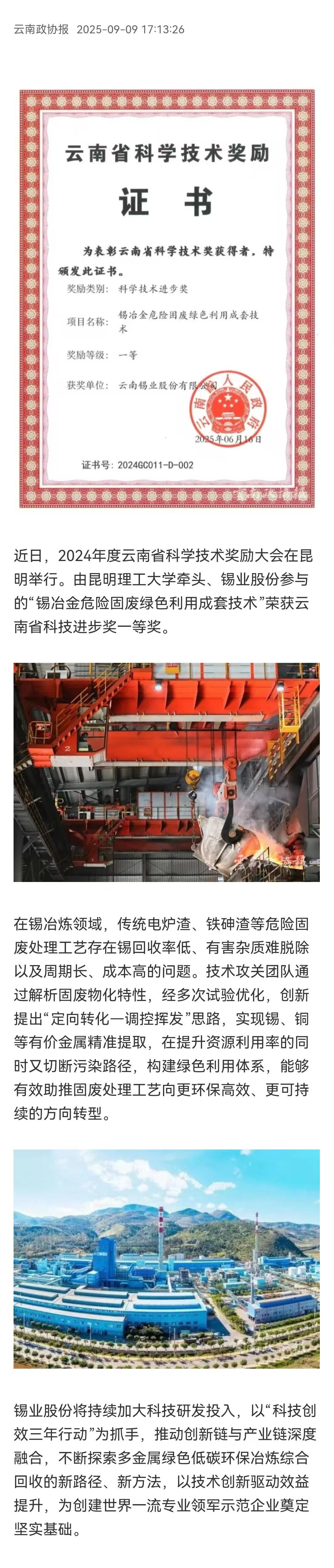 云南政协报:锡业股份荣获云南省科技进步奖一等奖