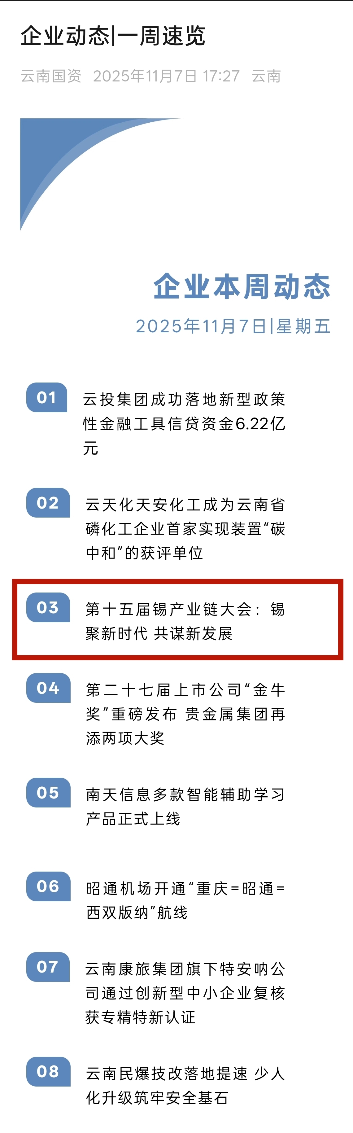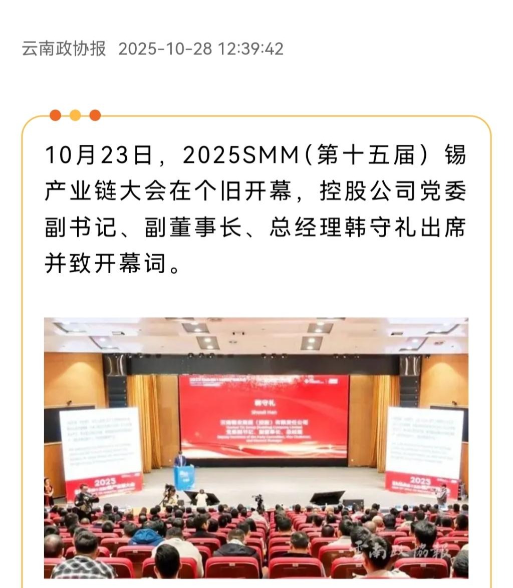 有色新闻、云南政协报:云锡党委副书记、副董事长、总经理韩守礼出席第十五届锡产业链大会