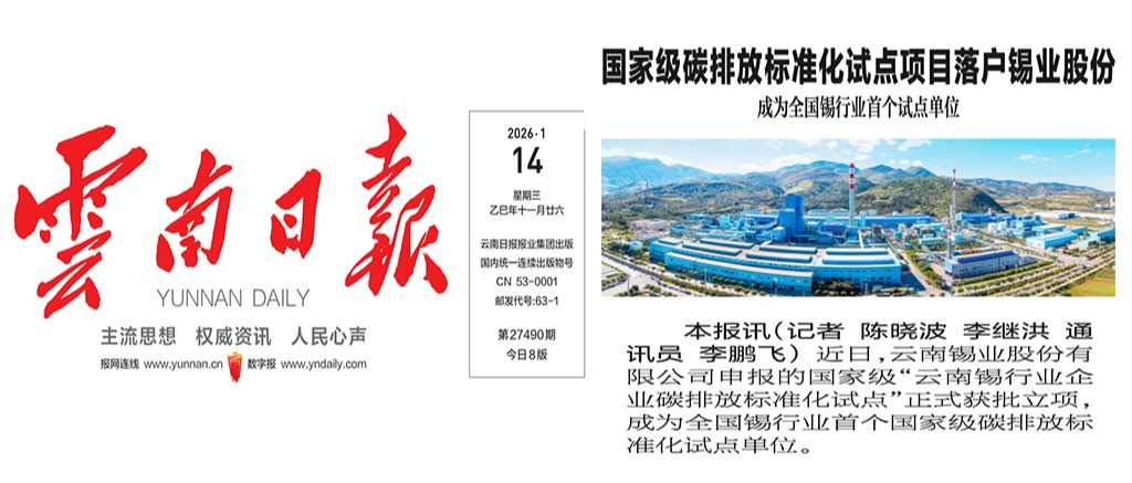 云南日报、有色新闻:锡行业首个国家级碳排放标准化试点项目落户云南锡业股份