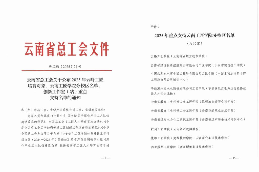 2025年12月29日,云南省总工会公布2025年云南工匠学院分校区名单,云锡工匠学院成功入选,成为全省获重点支持的十家工匠学院之一。