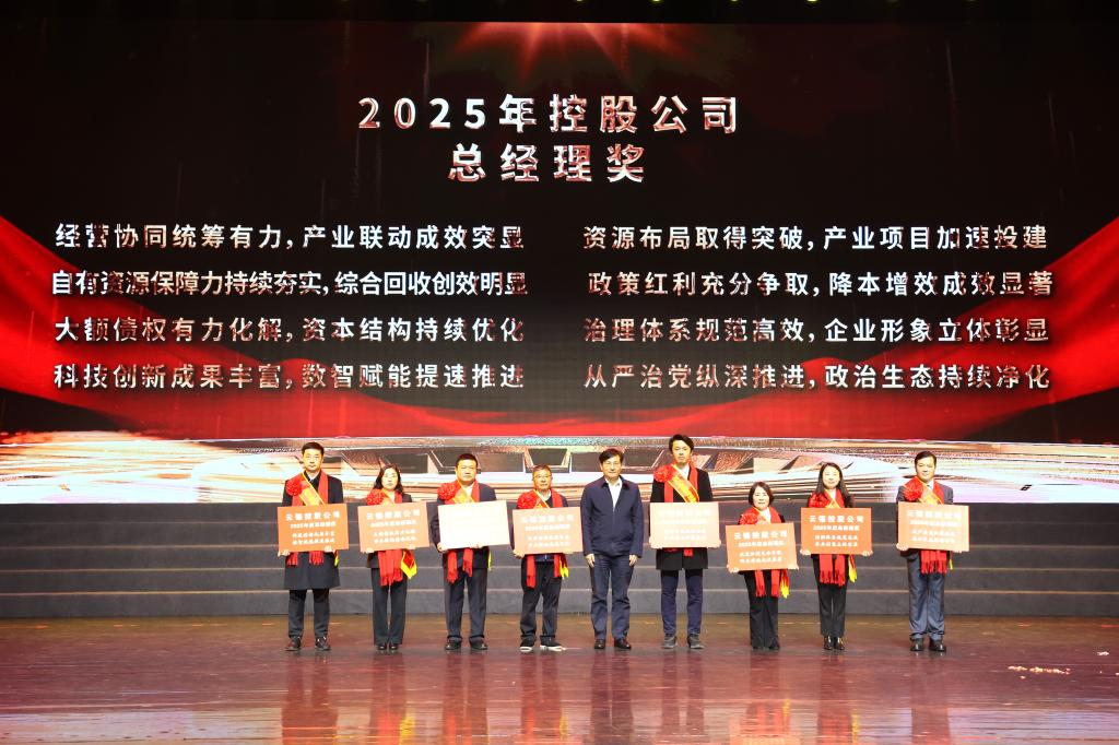 控股公司党委副书记、副董事长、总经理韩守礼为2025年控股公司总经理奖获奖团队代表颁奖并合影。