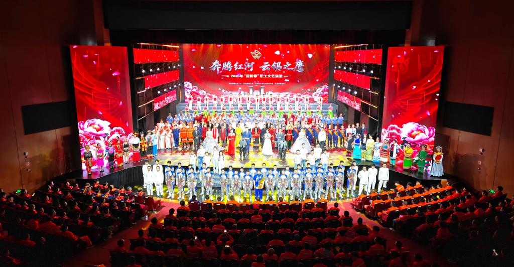 奔腾红河潮涌不息,云锡之鹰志存高远。2月8日晚,由云锡控股公司工会和红河州总工会联合州文联、州歌舞团共同举办的“奔腾红河·云锡之鹰”2026年云锡“迎新春”职工文艺展演在蒙自市红河大剧院隆重举行,以文艺为桥、以团结为翼,彰显政企共兴、民族团结、产业繁荣的时代气象。