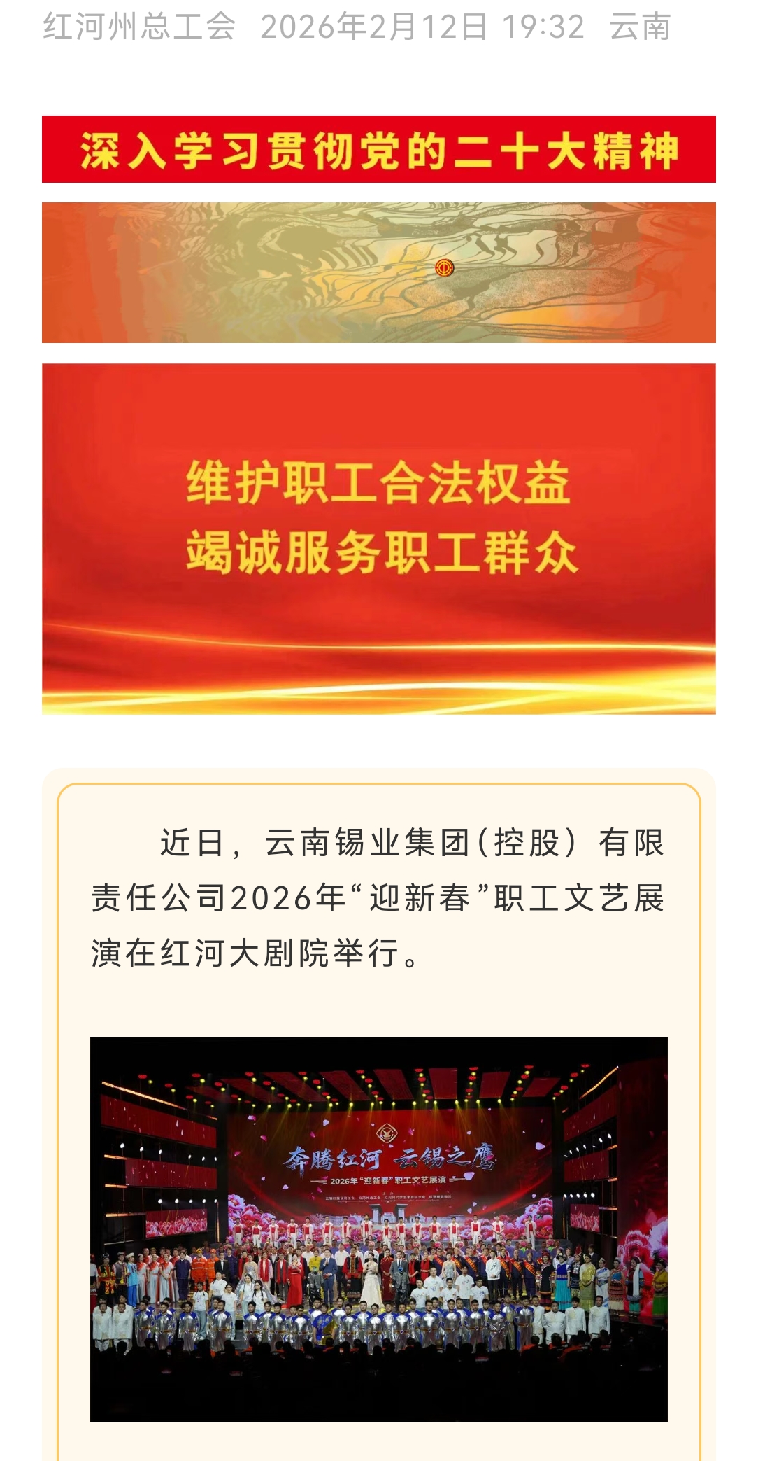链接:(红河日报)、(云岭职工)、(红河发布)、(红河州总工会)、(云南省红河大剧院发布)