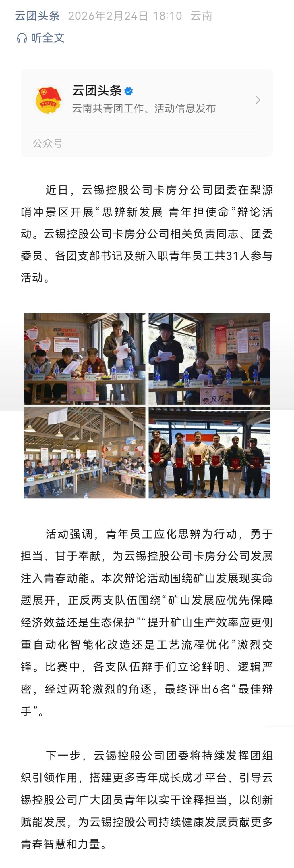 云团头条:云锡控股公司卡房分公司团委开展“思辨新发展 青年担使命”辩论活动