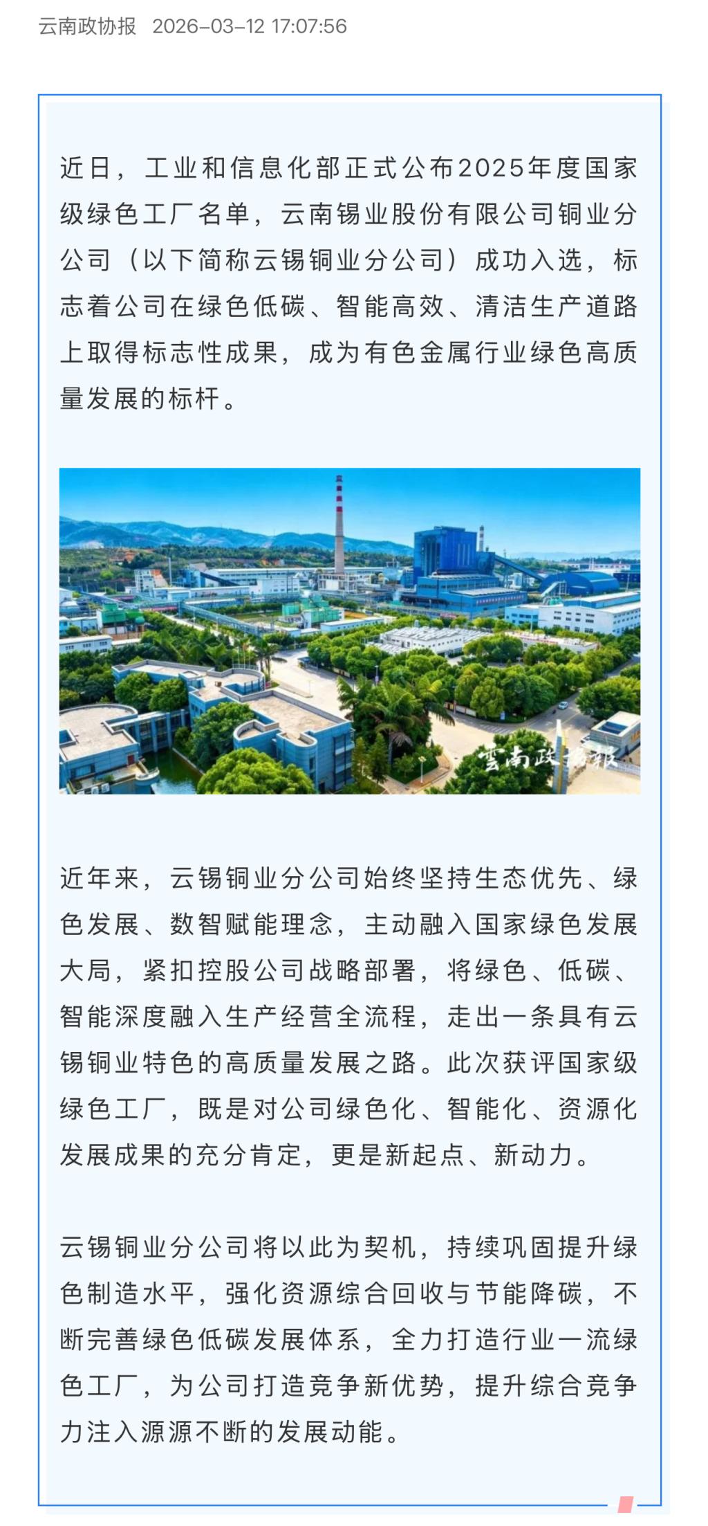 中国有色金属杂志、中国有色金属报:云锡铜业分公司成功入选2025年度国家级绿色工厂名单