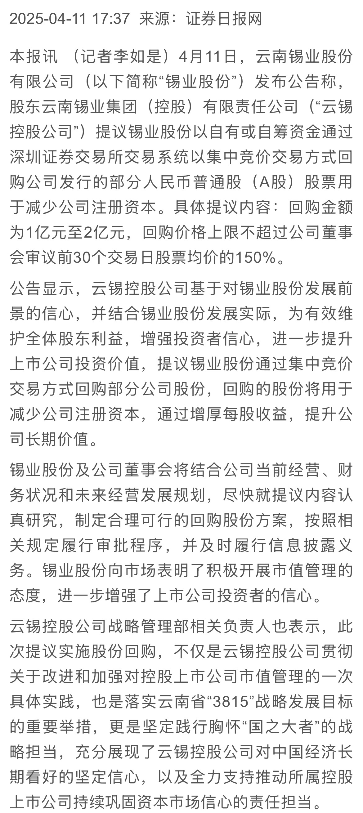 证劵日报:践行市值管理 股东提议锡业股份回购股票用于减少注册资本