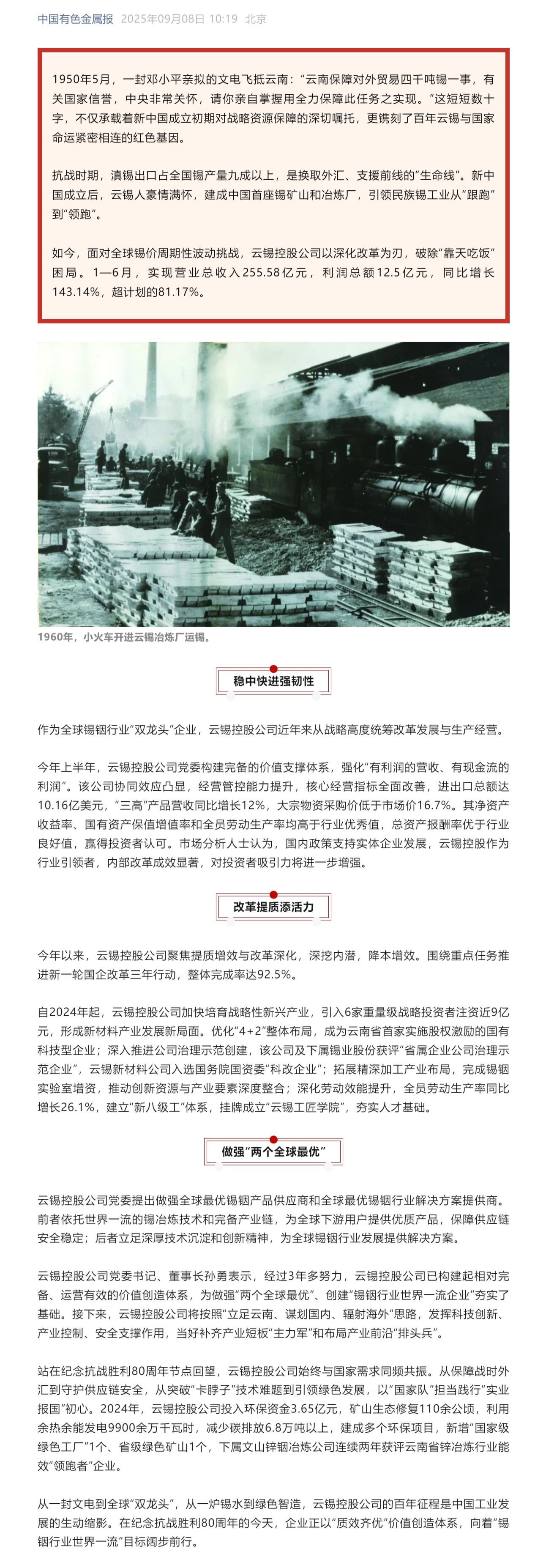 云南国资、省国资委网站、有色新闻、中国有色金属报:云锡控股公司价值创造体系质效齐优