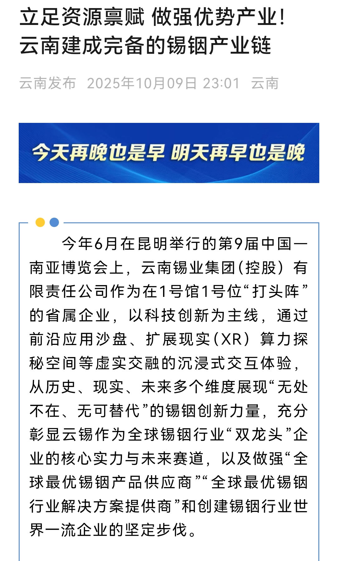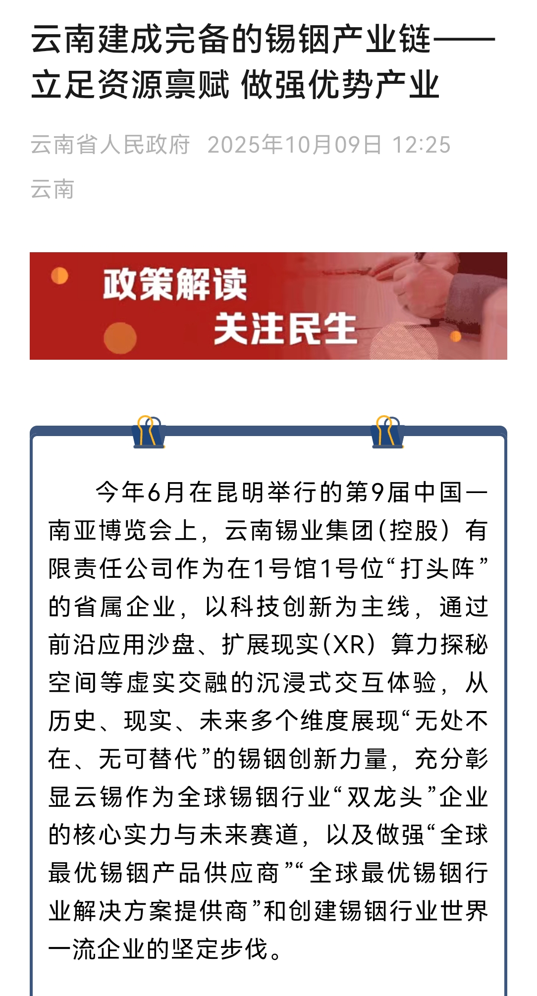 云南日报、云南发布、云南省人民政府:云南建成完备的锡铟产业链——立足资源禀赋 做强优势产业