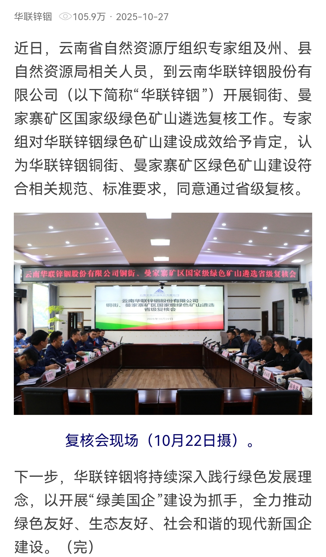 新华网:华联锌铟铜街、曼家寨矿区国家级绿色矿山遴选通过省级复核