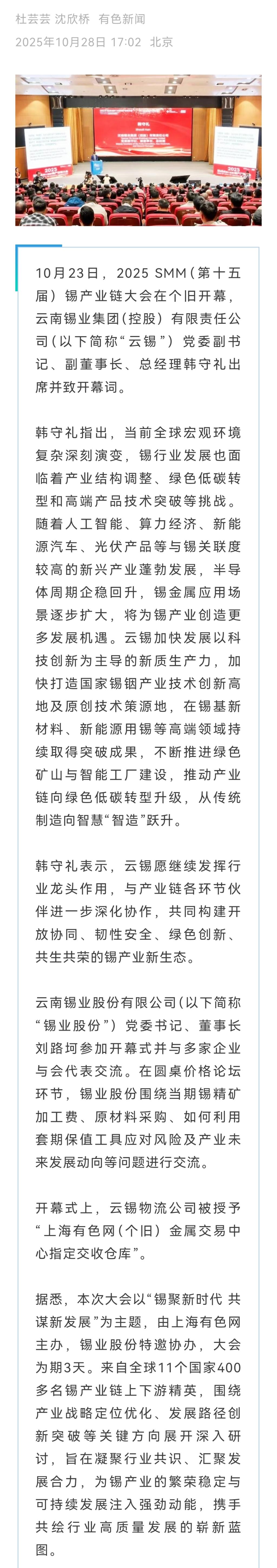 有色新闻、云南政协报:云锡党委副书记、副董事长、总经理韩守礼出席第十五届锡产业链大会