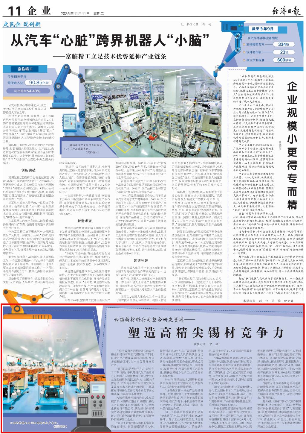 科技创新是云锡新材料公司发展的核心驱动力。通过整合研发资源,公司建有博士后科研工作站,拥有云南省锡新材料技术创新中心(筹)、电子锡焊料制备先进技术与应用工程研究中心、锡化工工程技术研究中心、昆明市软钎焊料工程技术研究中心等创新平台。解秋莉介绍,通过持续开展技术创新,公司研发出低辐射锡、金锡球、超细丝、预成型焊片、锡基阻燃剂、高纯铟等新产品,推动产业链、创新链、知识产权链深度融合。目前,公司拥有授权发明专利110余项、实用新型专利20余项,制定或参与国家及行业标准80余项。