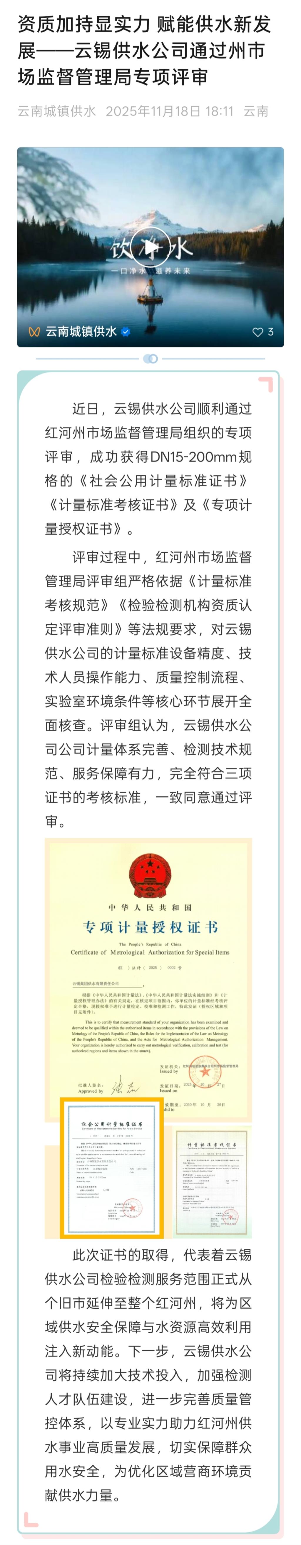 云南城镇供水:资质加持显实力 赋能供水新发展——云锡供水公司通过州市场监督管理局专项评审