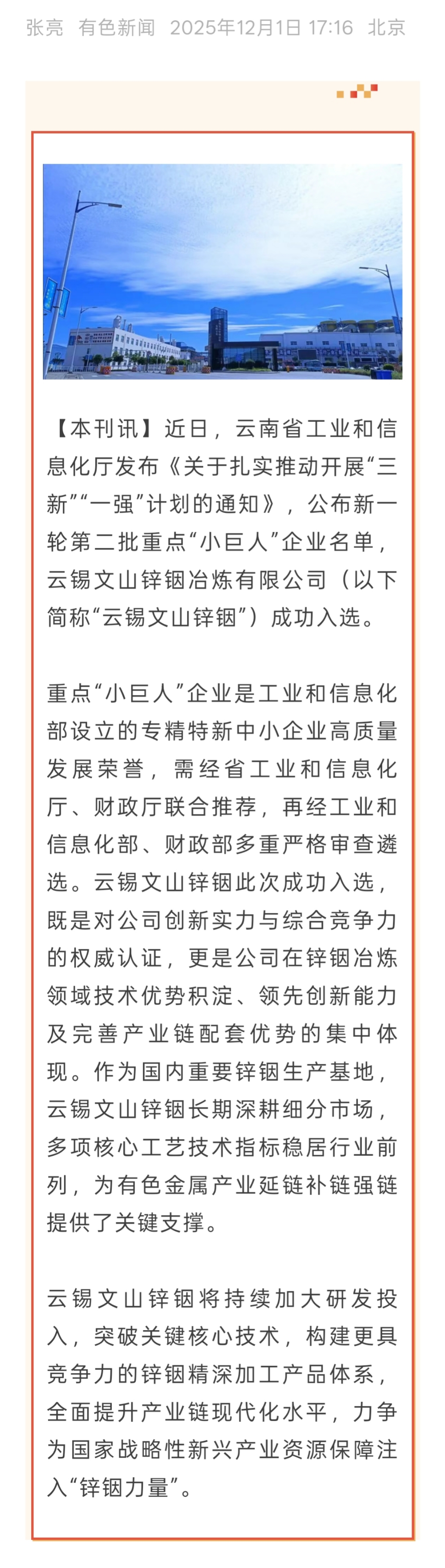 有色新闻:云锡文山锌铟成功入选工业和信息化部重点“小巨人”企业