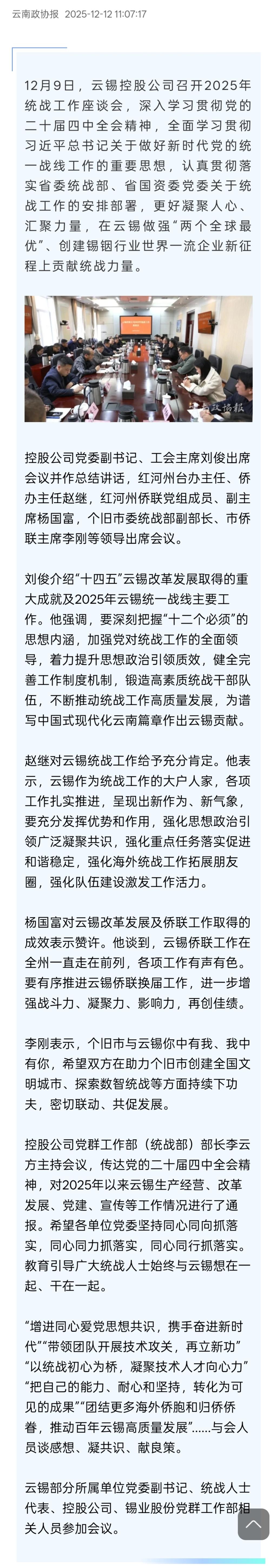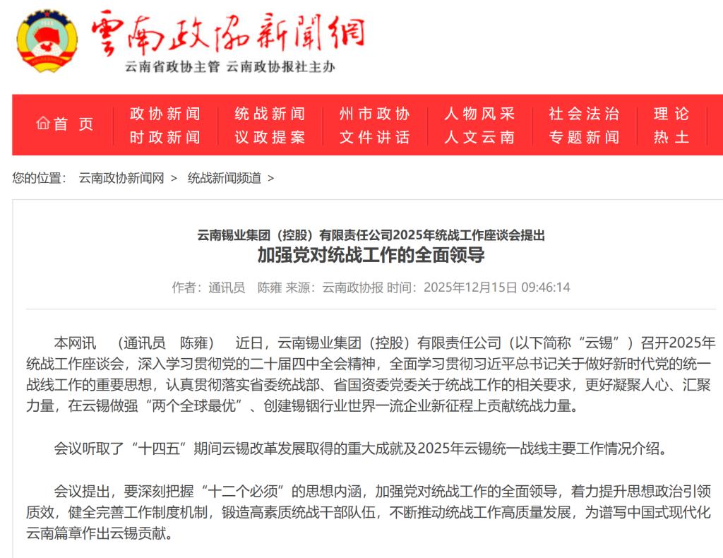 云南政协报:云锡控股公司召开2025年统战工作座谈会