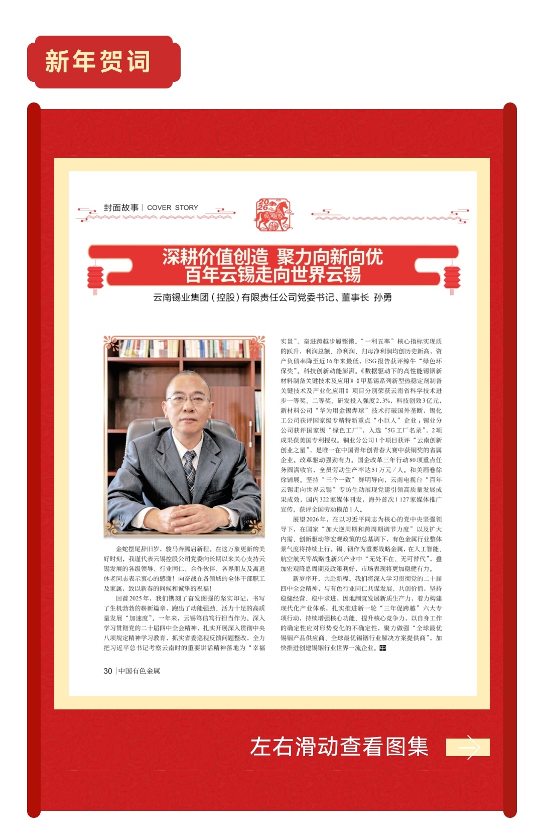 金蛇摆尾辞旧岁,骏马奔腾启新程。在这万象更新的美好时刻,我谨代表云锡控股公司党委向长期以来关心支持云锡发展的各级领导、行业同仁、合作伙伴、各界朋友及离退休老同志表示衷心的感谢!向奋战在各领域的全体干部职工及家属,致以新春的问候和诚挚的祝福!