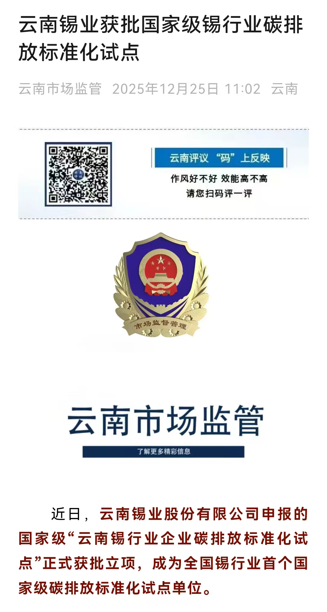 来源:云南日报、有色新闻、中国有色金属报、云南市场监管、云南政协报、云南国资