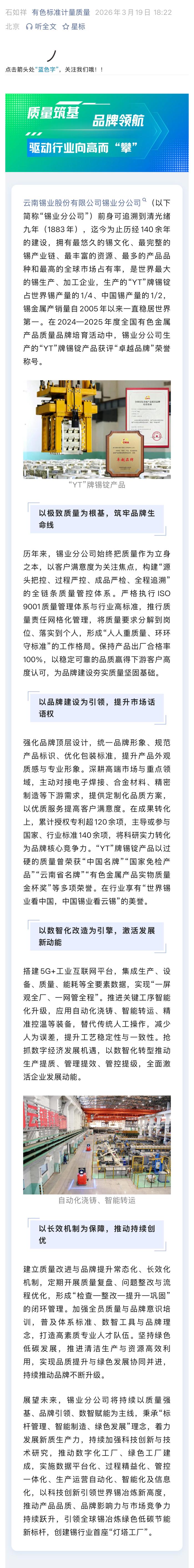 有色标准计量质量:数智赋能创卓越 品质坚守铸品牌——锡业分公司“YT”牌锡锭产品荣获有色行业“卓越品牌”称号