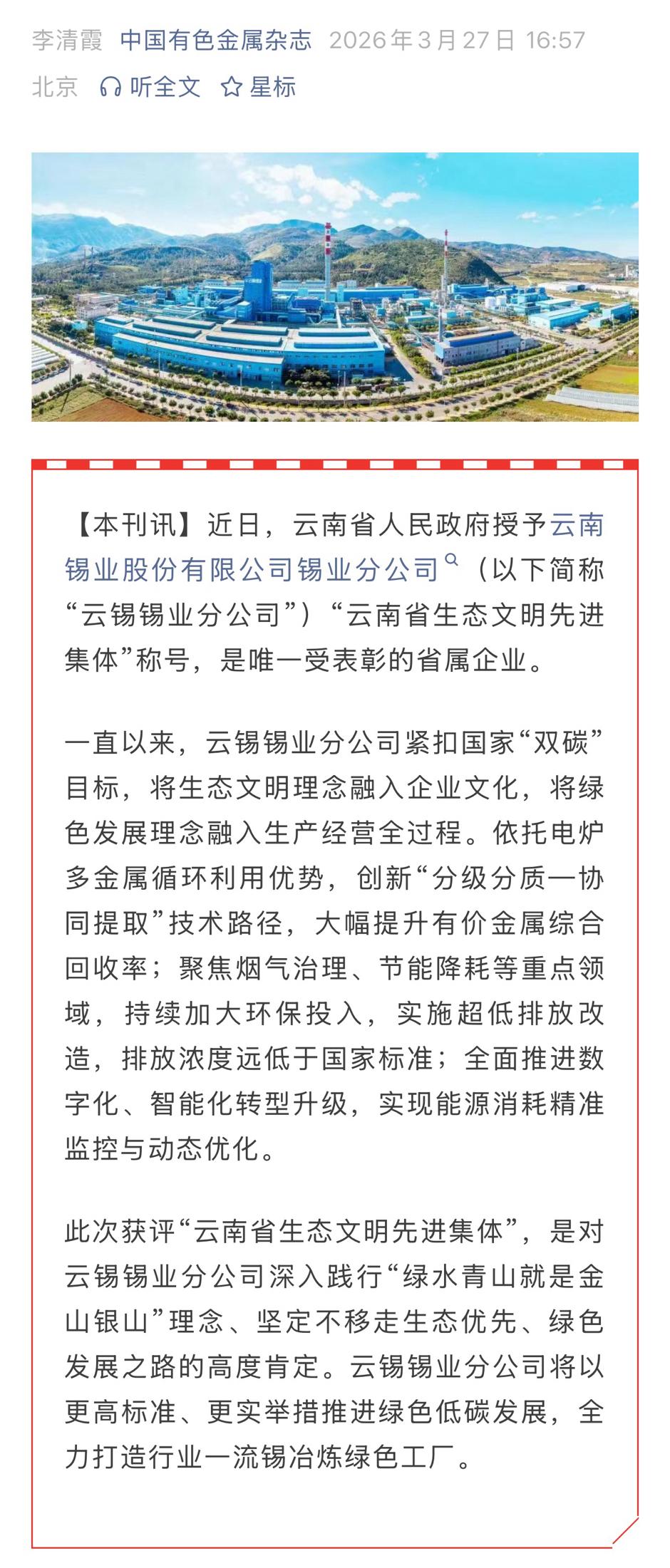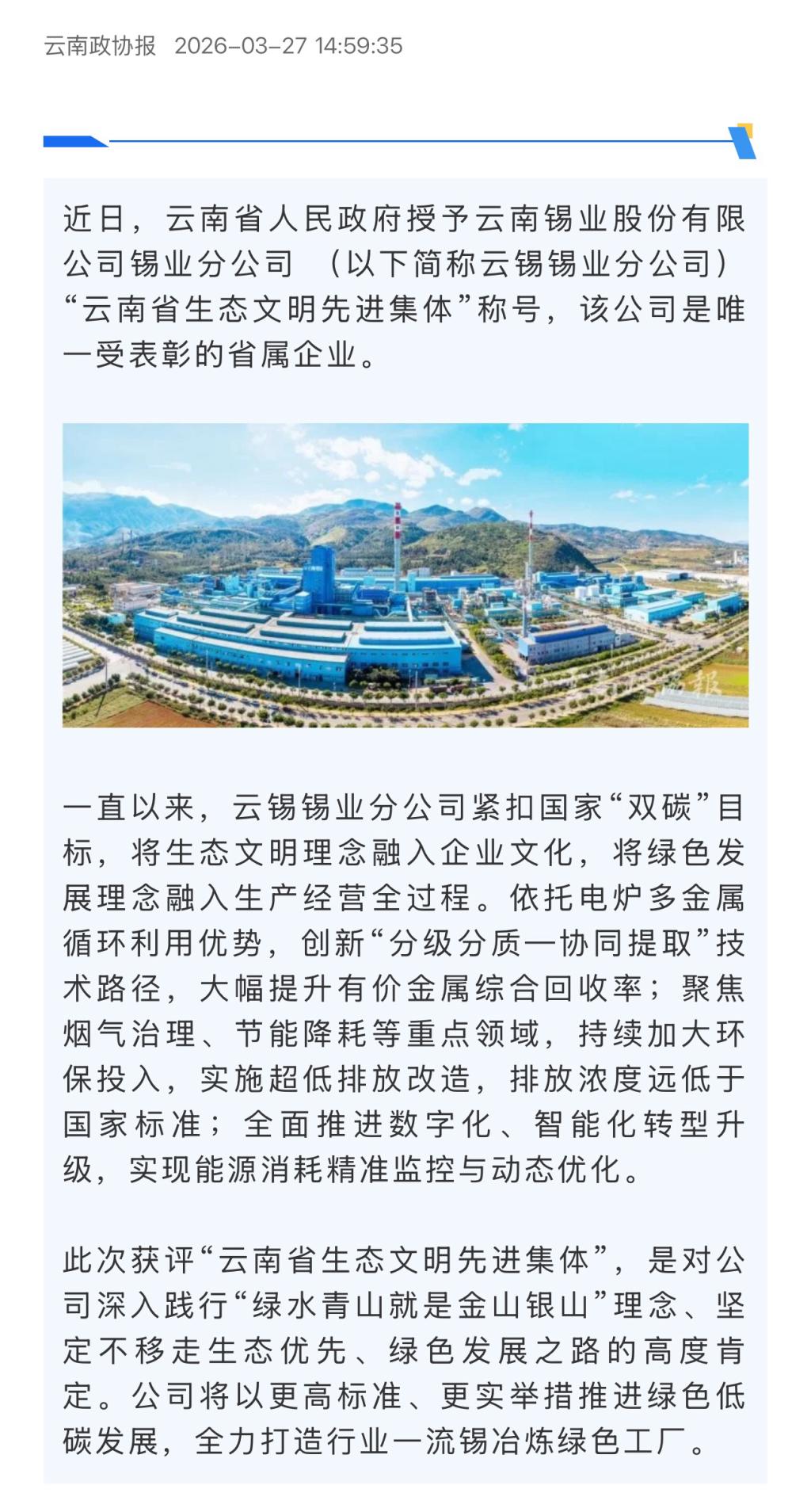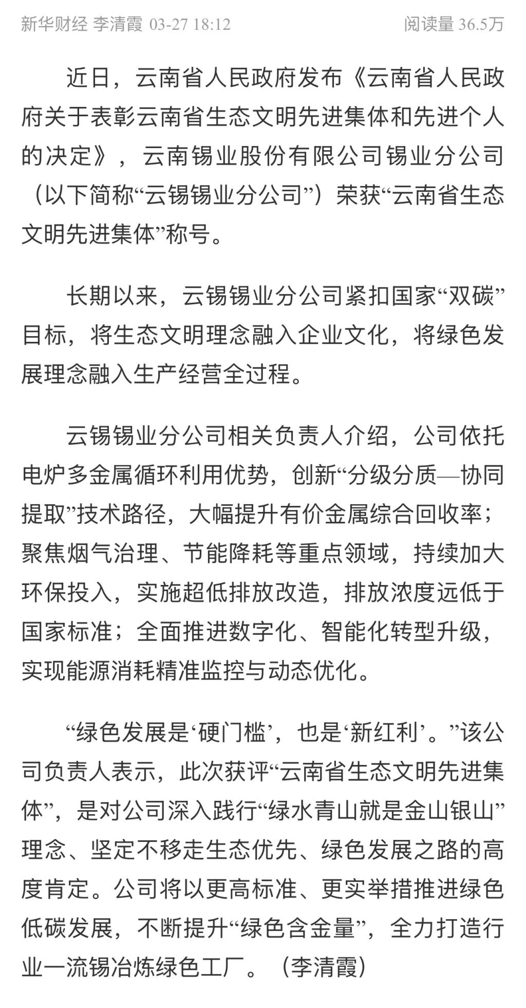新华财经:云锡锡业分公司获评“云南省生态文明先进集体”