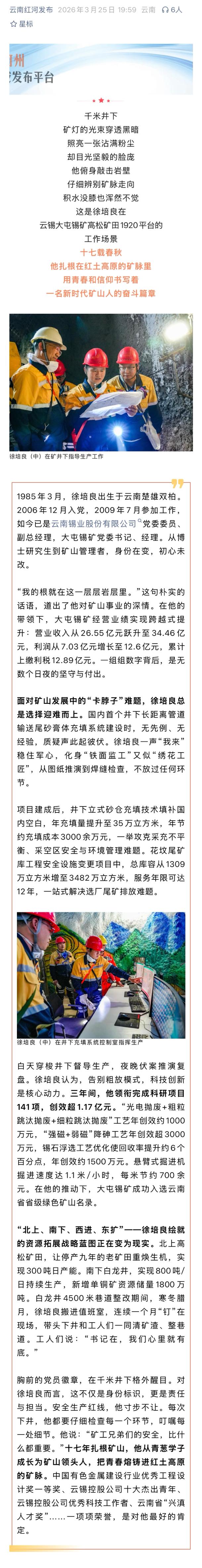 云南红河发布:“兴滇人才奖”获得者徐培良:把青春写进岩层 让信仰点亮矿山